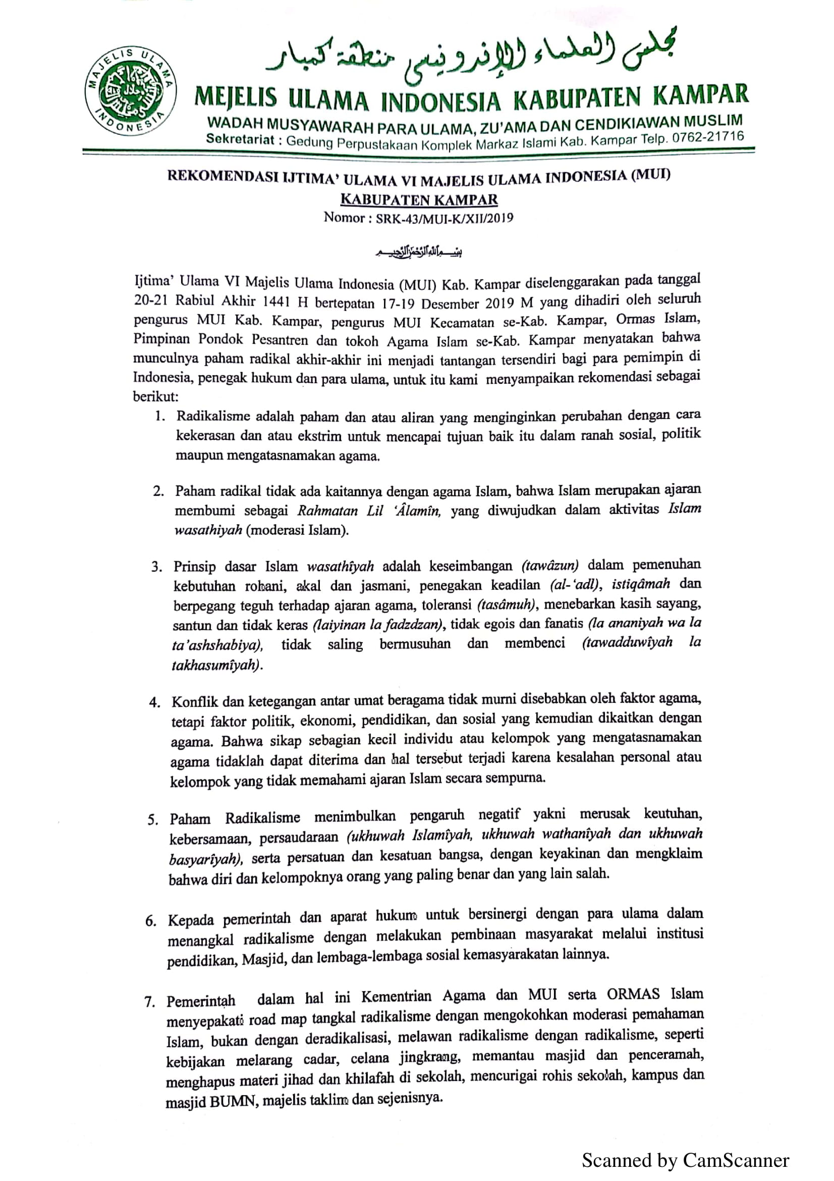 Rekomendasi Ijtima’ Ulama VI Majelis Ulama Indonesia (MUI) Kabupaten Kampar Tahun 2019