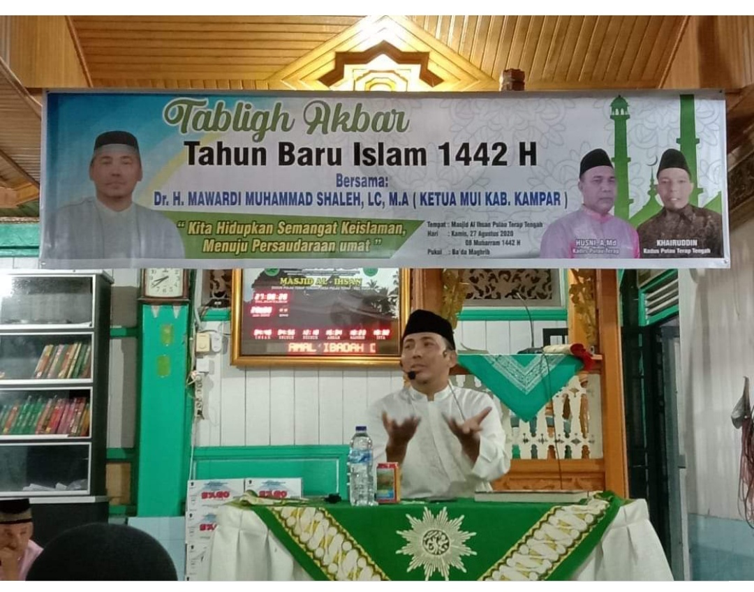 Ketua MUI Kampar Dr. H. Mawardi M. Saleh, Lc, MA memberikan ceramah dalam acara Tabligh Akbar Peringatan Tahun Baru Islam 1442 H di Masjid Al-Ihsan Pulau Terap Kec. Kuok, Kamis (27 Agustus 2020 M/ 09 Muharram 1442 H). Acara yang dihadiri ratusan jama’ah tersebut, mengambil tema ‘Hidupkan Semangat Keislaman Menuju Persaudaraan Umat’.
