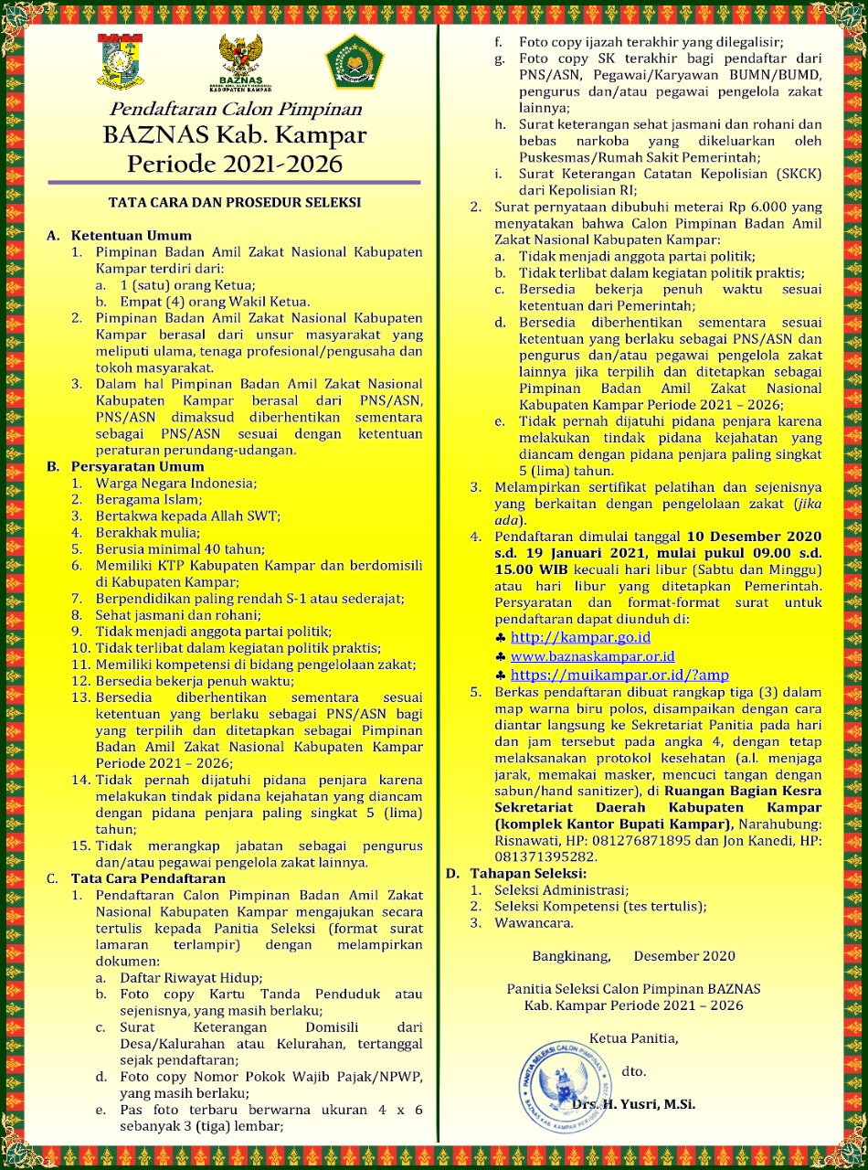 Badan Amil Zakat Nasional (BAZNAS) Kabupaten Kampar membuka pendaftaran calon pimpinan (komisioner) yang terdiri dari 1 (satu) orang Ketua dan 4 (empat) orang Wakil Ketua, untuk masa jabatan 2021 – 2026.