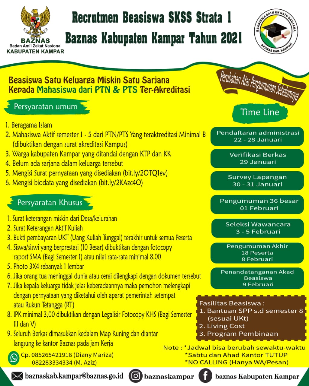 Badan Amil Zakat Nasional (Baznas) Kabupaten Kampar kembali membuka program beasiswa Satu Keluarga Satu Sarjana (SKSS) tahun 2021. Beasiswa ini diperuntukkan bagi mahasiswa yang berasal dari Perguruan Tinggi Negeri (PTN) maupun Perguruan Tinggi Swasta (PTS) yang terakreditasi minimal B oleh BAN-PT.