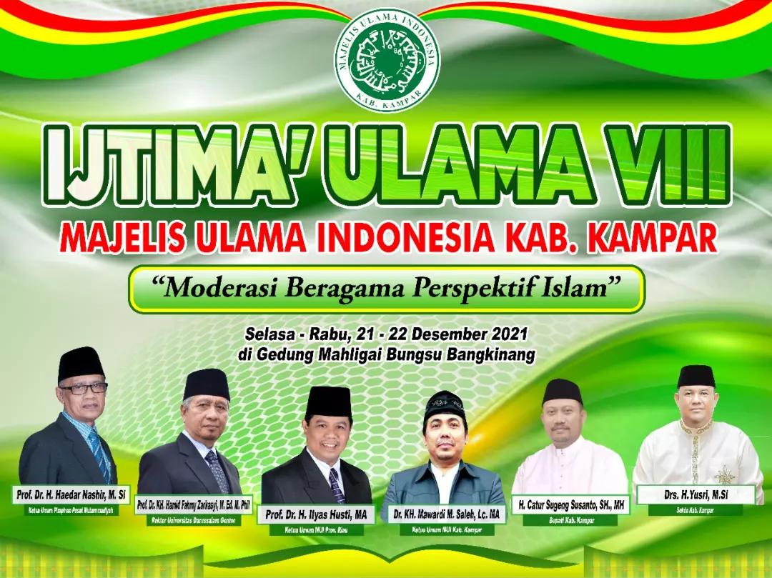 Bangkinang Kota – Majelis Ulama Indonesia (MUI) Kabupaten Kampar menggelar Ijtima’ Ulama  ke VIII dengan mengangkat tema “Moderasi Beragama Perspektif Islam“. Kegiatan ini berlansung pada tanggal – 18 Jumadil Ula 1443 H/21 – 22 Desember 2021 yang dilaksanakan di Gedung Mahligai Bungsu Bangkinang Kota dan secara resmi dibuka oleh Bupati Kampar H. Catur Sugeng Susanto, SH., MH.