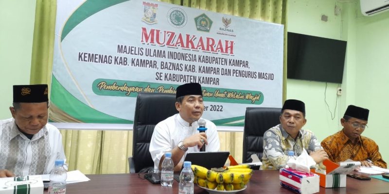 Bangkinang Kota – Majelis Ulama Indonesia Kabupaten Kampar mengundang Kepala Kantor Kementerian Agama Kab. Kampar H. Fuadi Ahmad, SH., MAB; Ketua Badan Amil Zakat Nasional (BAZNAS) Kab. Kampar Purwadi, SE; Divisi Pembinaan Nazhir BWI Perwakilan Kab. Kampar H. Syamsuatir ME.Sy, dan seluruh Pengurus Masjid dari Kec. Bangkinang Kota, Bangkinang, Salo, Kuok dan Kampar sebanyak 30 Orang dalam kegiatan muzakarah yang mengangkat tema tentang “Pemberdayaan dan Pembinaan Persatuan Umat Melalui Masjid” (24/11/2022).