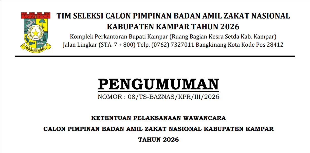 PENGUMUMANKETENTUAN PELAKSANAAN WAWANCARACALON PIMPINAN BADAN AMIL ZAKAT NASIONAL (BAZNAS) KABUPATEN KAMPAR TAHUN 2026 Maret 5, 2026Maret 5, 2026oleh ADMIN MUI KAMPAR-1 Dilihat PENGUMUMAN TATA TERTIB WAWANCARAUnduh Post Views: 1 Bagikan ini: Klik untuk membagikan di Facebook(Membuka di jendela yang baru) Facebook Klik untuk berbagi di X(Membuka di jendela yang baru) X Menyukai ini:Suka Memuat... Jangan LewatkanPengumuman Hasil Seleksi Kompetensi Calon Pimpinan BAZNAS Kabupaten Kampar Periode 2026β2031Pengumuman Tata Tertib Pelaksanaan Seleksi Kompetensi Calon Pimpinan BAZNAS Kabupaten Kampar Tahun 2026MUI Kabupaten Kampar Bersinergi dengan Pemerintah Daerah Dorong Sertifikasi Halal untuk Perkuat UMKMPENGUMUMAN RESMI HASIL SELEKSI ADMINISTRASI CALON PIMPINAN BAZNAS KABUPATEN KAMPAR PERIODE 2026β2031MUI Kampar dan Diskominfo Resmi Teken MoU Program Siaran Ramadhan 1447 H